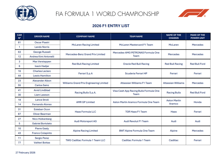 2026 FIA Formula One World Championship Entry List