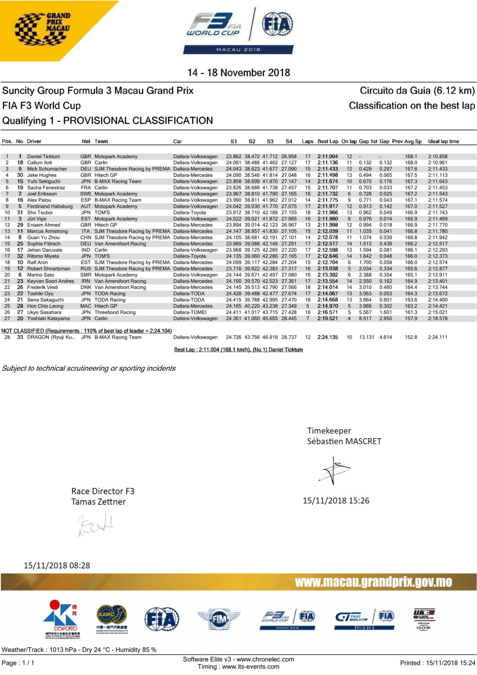 Dan Ticktum holds provisional pole position for the Macau GP Qualification Race after edging out Callum Illot and Mick Schumacher during the opening FIA F3 World Cup qualifying session.