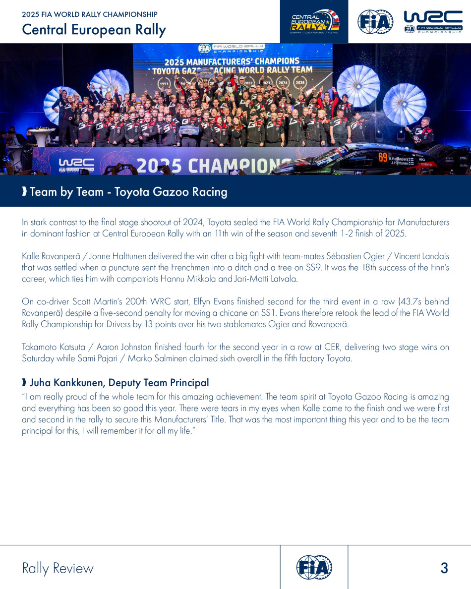 Kalle Rovanperä / Jonne Halttunen took a convincing third victory of the season at the Central European Rally as Toyota Gazoo Racing WRT claimed a fifth consecutive FIA World Rally Championship for Manufacturers with two rounds to spare