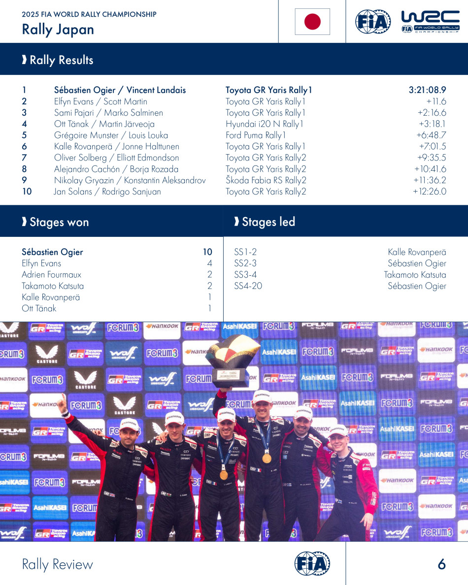 Sébastien Ogier and co-driver Vincent Landais secured their sixth victory of the 2025 FIA World Rally Championship season at Rally Japan, leading home a Toyota Gazoo Racing WRT 1-2-3 at the team’s home event.