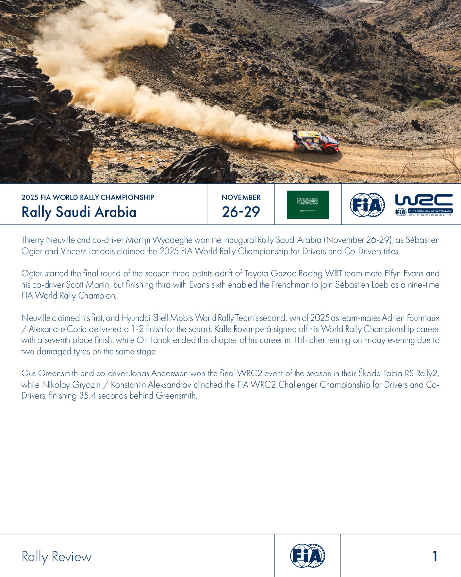 Thierry Neuville and co-driver Martijn Wydaeghe won the inaugural Rally Saudi Arabia (November 26-29), as Sébastien Ogier and Vincent Landais claimed the 2025 FIA World Rally Championship for Drivers and Co-Drivers titles.