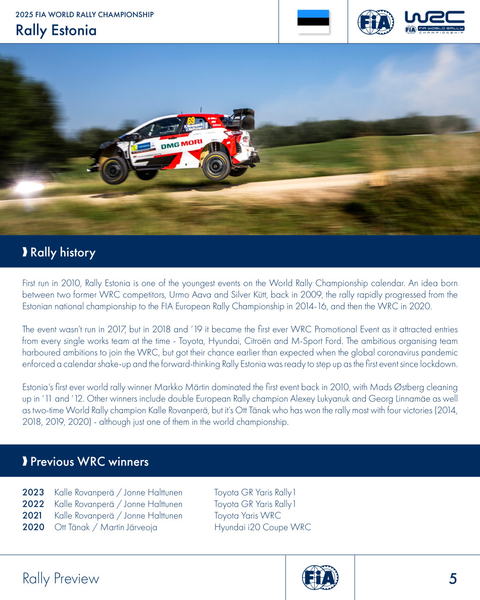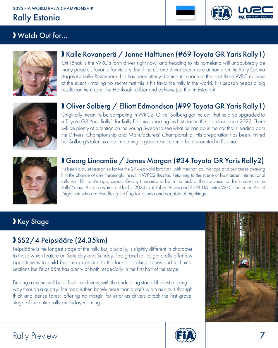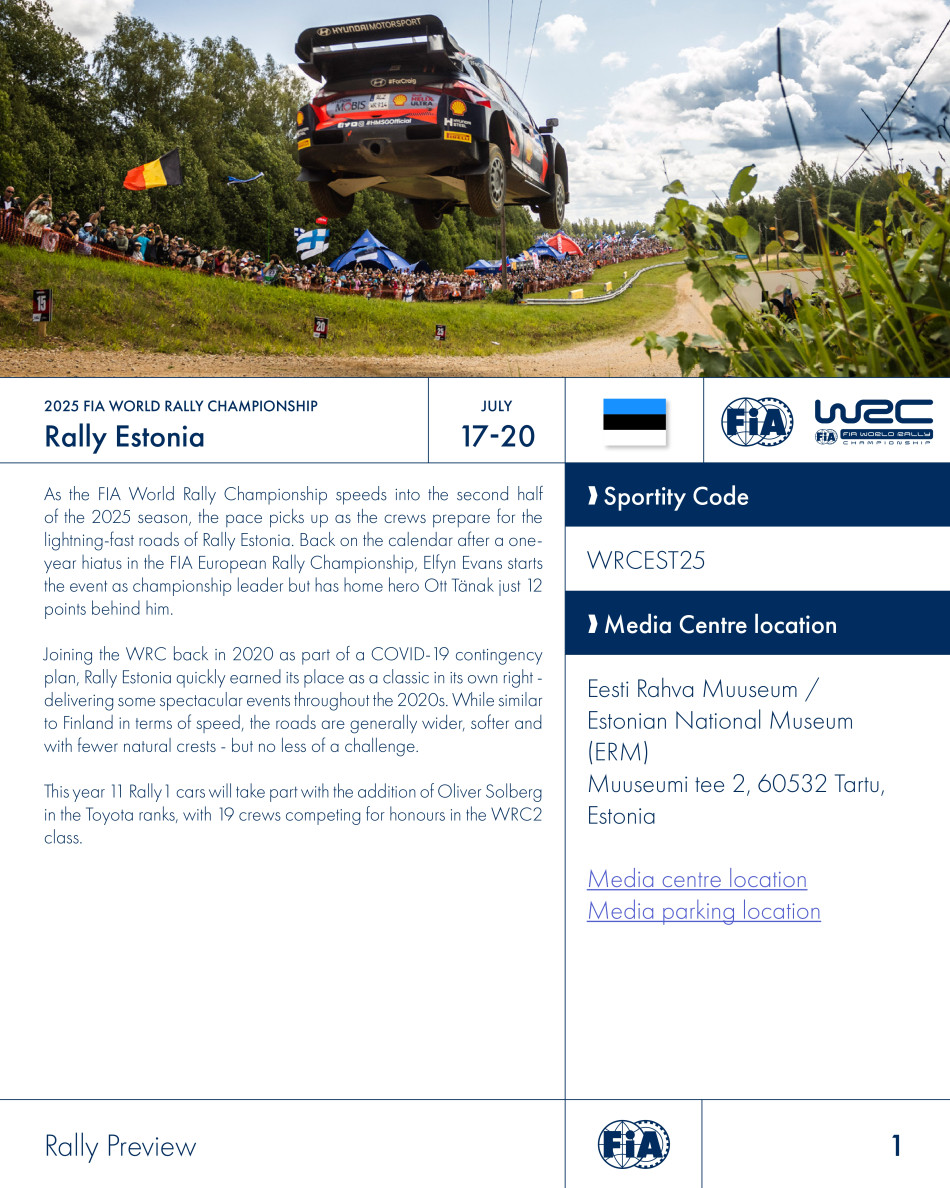 As the FIA World Rally Championship speeds into the second half of the 2025 season, the pace picks up as the crews prepare for the lightning-fast roads of Rally Estonia. Back on the calendar after a one year hiatus in the FIA European Rally Championship, Elfyn Evans starts the event as championship leader but has home hero Ott Tänak just 12 points behind him.