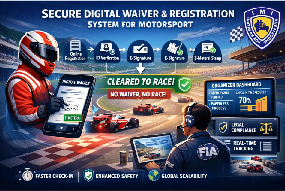 This project introduces a fully digital registration and waiver system designed to modernize motorsport event operations. Developed in Indonesia by Ikatan Motor Indonesia, the solution replaces manual paperwork with a secure, legally compliant digital process, including electronic signatures and integrated digital stamp duty (e-meterai). The system enhances efficiency, reduces administrative burden, and improves legal compliance—while creating a scalable model for FIA member clubs worldwide.