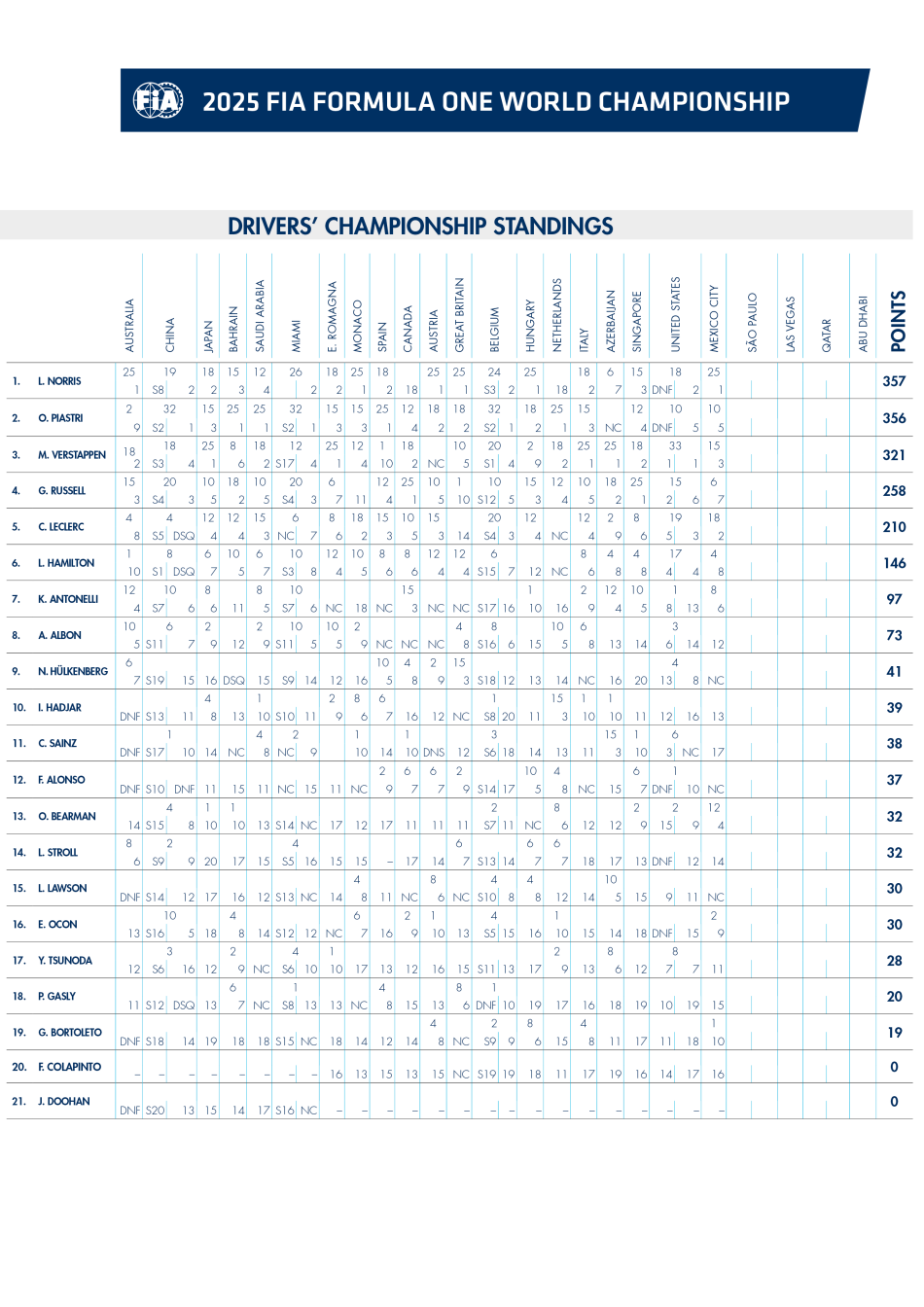 DRIVERS 1 – Lando NORRIS (McLaren) 2 – Charles...
