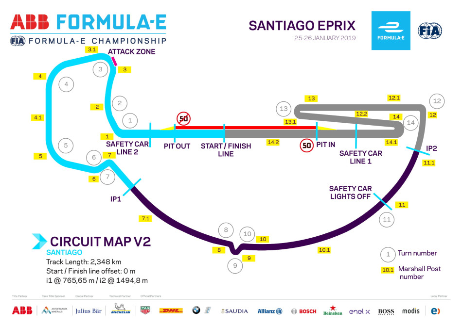 The Attack Mode led to a fascinating mixture of race strategies up and down the order, and here in Santiago, the drivers will have to go off-line on the outside of Turn 3 in order to make their activation.