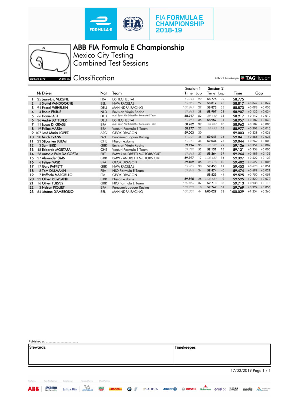 Reigning champion Jean-Eric Vergne has topped the final in-season test session of the 2018/19 ABB FIA Formula E Championship in Mexico City for DS TECHEETAH. Following another tough race day for rookie HWA RACELAB driver Stoffel Vandoorne, he posted the second fastest time ahead of fellow rookie Pascal Wehrlein who also had a torrid time in the Mexico City E-Prix losing out on the win on the final lap.