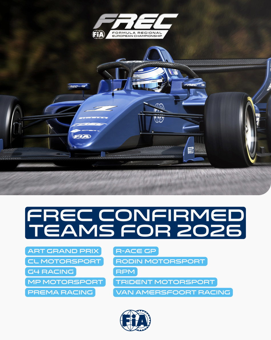 The Fédération Internationale de l'Automobile (FIA), the global governing body for motor sport and the federation for mobility organisations worldwide, and the Automobile Club d’Italia (ACI) are proud to announce the selected teams for the FIA Formula Regional European Championship (FREC) 2026.