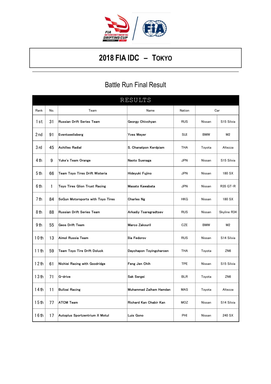 Georgy Chivchyan, FIA Intercontinental Drifting Cup winner, said: “This is a very memorable moment for me, and I knew from the Solo runs that I would have to battle my team-mates early on in the Battles. I wanted for everybody to be successful, but every battle is very important to me and I’m grateful I could make it this far. This track in Tokyo is ‘the place’ to drift at, and it really matched my car and I did my best. I wish I could’ve battled my team-mate higher up the ladder, but at the last FIA IDC he beat me here, so it was a good bit of revenge to be able to take the win this time.”