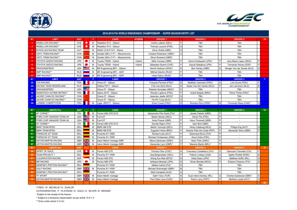 Pierre Fillon, President of the Automobile Club de l’Ouest: “Endurance racing is in excellent health, as we can see from this capacity entry list to the WEC, and by the continued high level of interest in the 24 Hours of Le Mans. It is very rewarding to see so many competitors moving from the ELMS to the WEC, or from LMP2 to LMP1, which demonstrates how well our pyramid of endurance works. We are confident this transition year will lead us towards an even brighter and stronger future.”