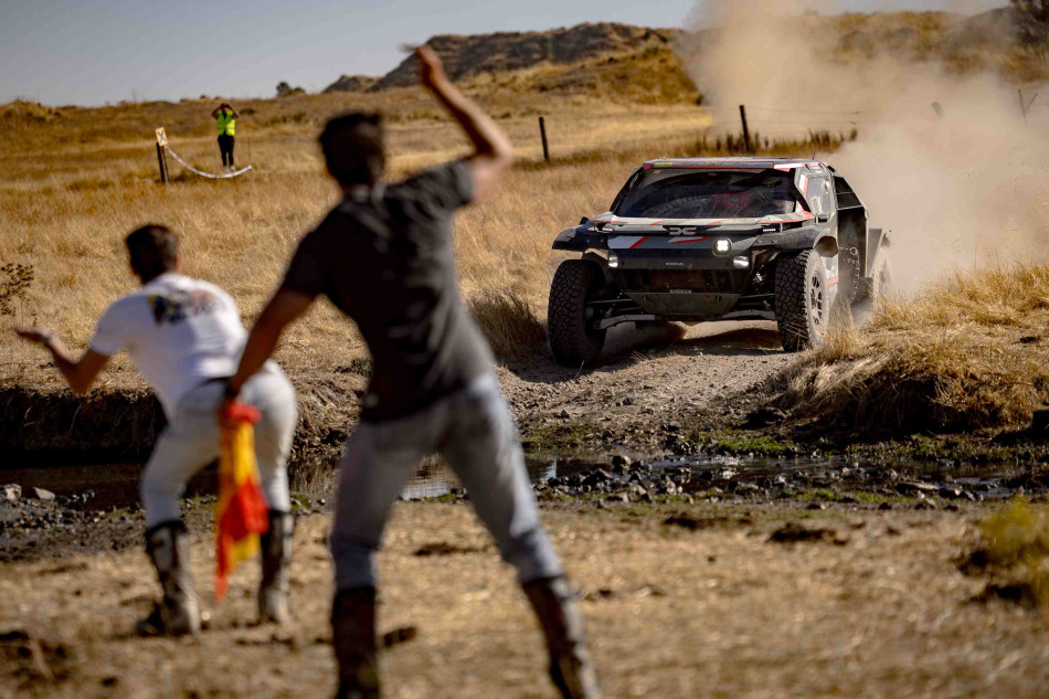 Stage three looped ran through remote western Spanish terrain for 308.26km before crews returned to Badajoz. Loeb got the better of Lategan, Moraes, Quintero and a returning Al-Rajhi to claim the stage win but a fire outbreak after 161km forced event officials to pause the car stage while the blaze was brought under control.